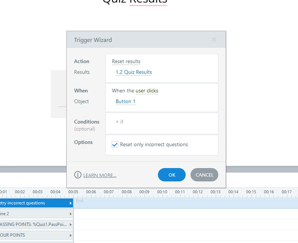 Before i spent time re-arranging my Javascript for a solution for this, i wanted to doublecheck Nedim's approach. And surprisingly its even easier. In The Trigger Wizard when resetting the results for a quiz ( question bank or normal ), you now have this option.