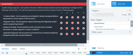 So I am a fairly new user ~1 yr. While I like the Likert scale for generic survey slide, I want to add an input field. no problem there but now I can't seem to get the player triggers to work. I ga...