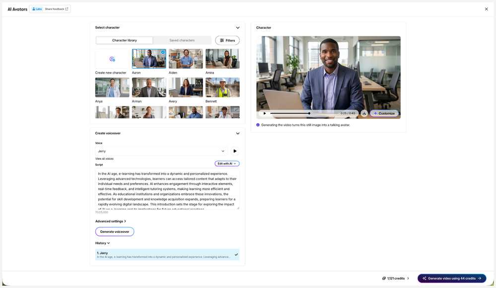 While the AI Avatars feature is included in your Articulate 360 AI subscription, generating AI avatar videos uses credits. (Learn how credits work.) You’ll be able to see how many credits you need before you generate.