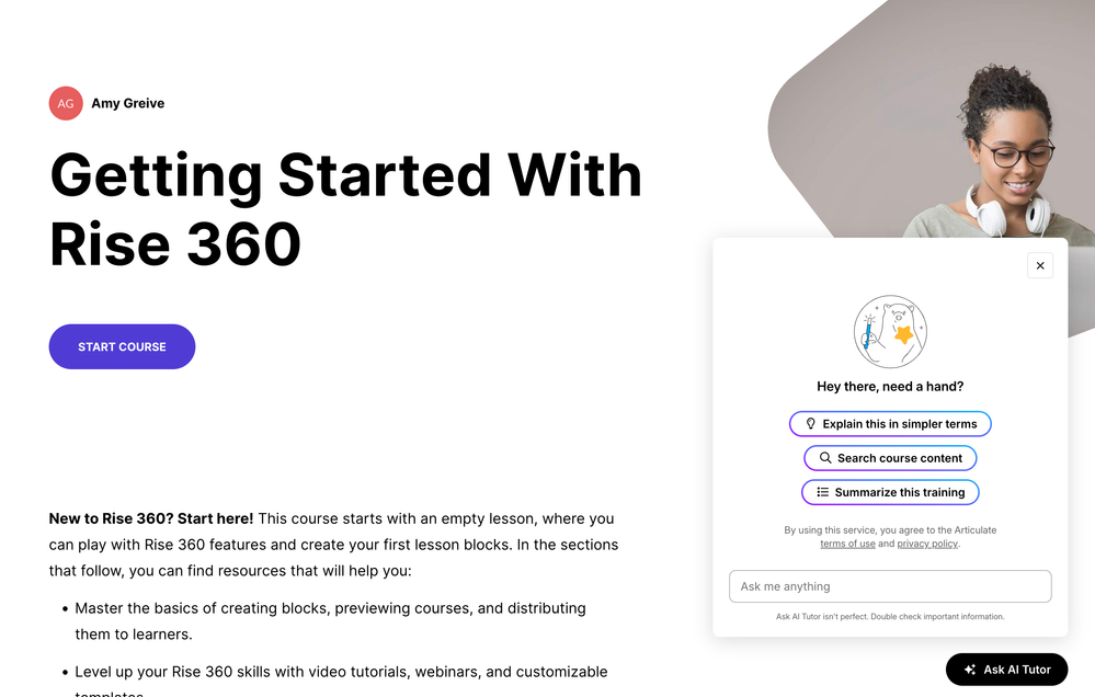More broadly, AI Tutor doesn’t change the accessibility of existing Rise blocks themselves, but it can offer an additional way for learners - especially those using assistive technologies - to engage with and get help understanding course content through a conversational interface.