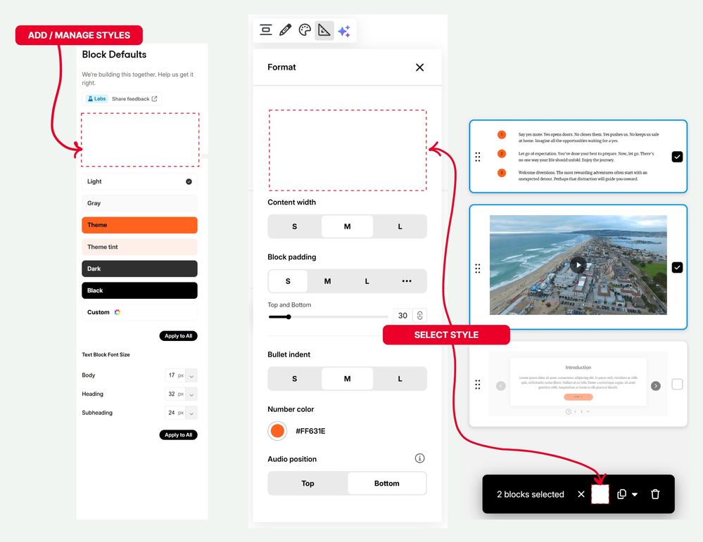 Note: Modified settings become the default for new blocks only after you've clicked Apply to All. - Exit the Themes menu.
