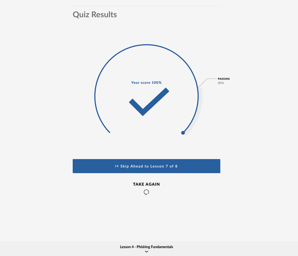 If a learner passes the quiz and skips ahead, the button on the results page displays the name of the lesson they'll skip to. We're actively exploring alternative learner-facing messaging, so please share your ideas via the feedback survey.