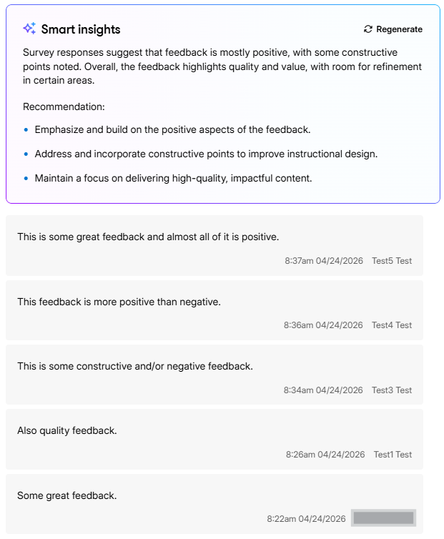 This is a great addition to what is becoming a plethora of tools to engage learners and improve training. I think the obvious missing piece to Surveys is the ability to export the responses. I put generic feedback in my test cases and unsurprisingly received generic AI insights. I'm confident it will do a good job at summarizing larger real-world data sets. I see no issues with setting the minimum number of responses to 5 for AI insights.