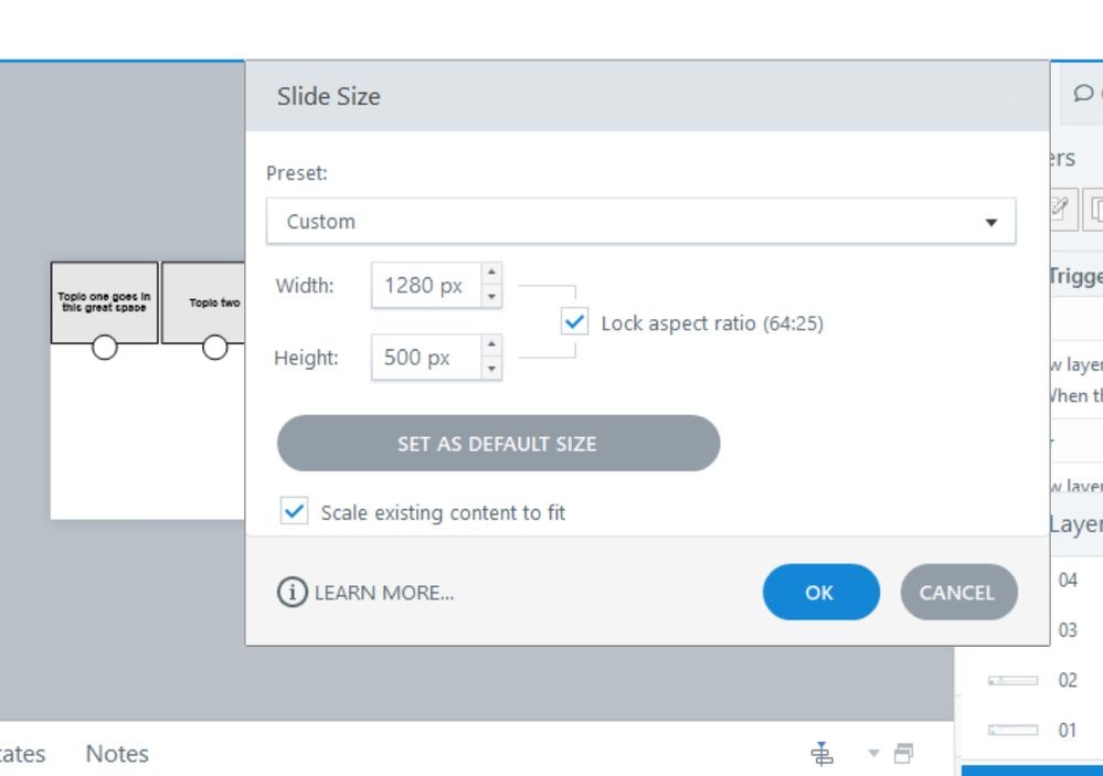The Storyline is designed at 1280x500 to allow for HD width format and still allow for the full interaction to fit (without scrolling) in a smaller screen.