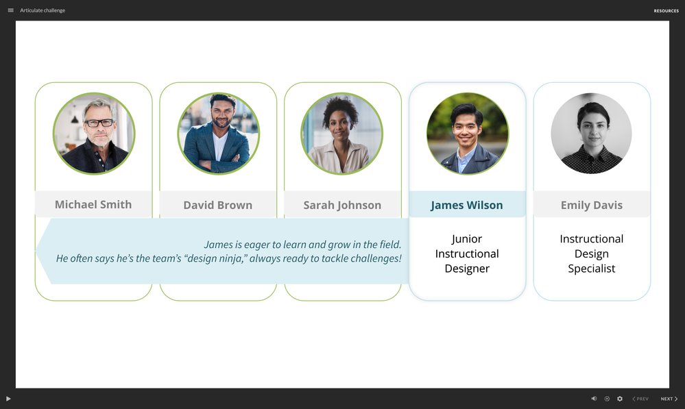 For, #ElearningChallenge #543, Interactive Team Member Introductions, I made a very simple, interactive scene with (imaginary) team members.