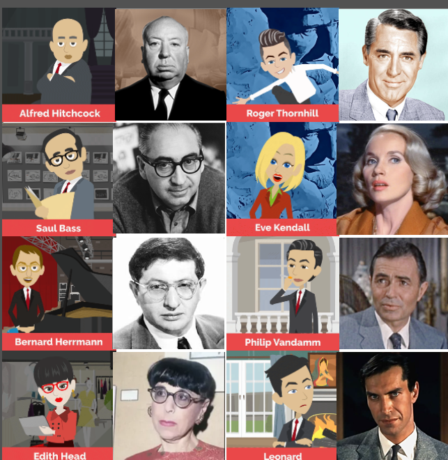 Below is a comparison of the Vyond “team” and the real people. Cary Grant proved impossible to match, but I think I nailed Hitchcock and Edith Head. If you are unfamiliar with Edith, think Edna Mode from the Incredibles movie.