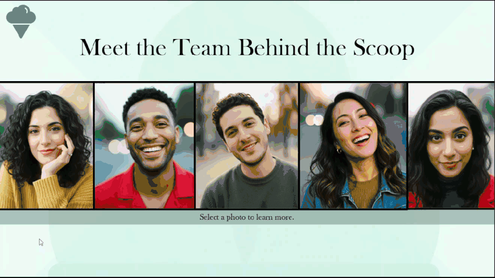 For this challenge, I created a Meet the Team slide for a fictitious ice cream company called Minty Peak Creamery.