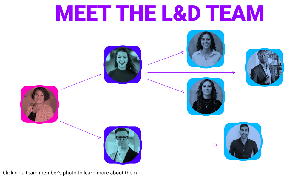 I chose to structure the experience around an organizational hierarchy because it provides learners with a clear and intuitive visual representation of how team members are connected. Rather than presenting information in isolation, this approach helps learners understand relationships, roles, and context at a glance, making the introduction feel more cohesive and purposeful.