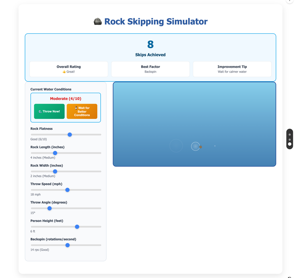 I used Canva-code to create a simulator for "skipping rocks". I iterated several times to get the best result as far as variables. I then copied and pasted the code into the Rise Code Block and added some introduction. I think it came out amazing.