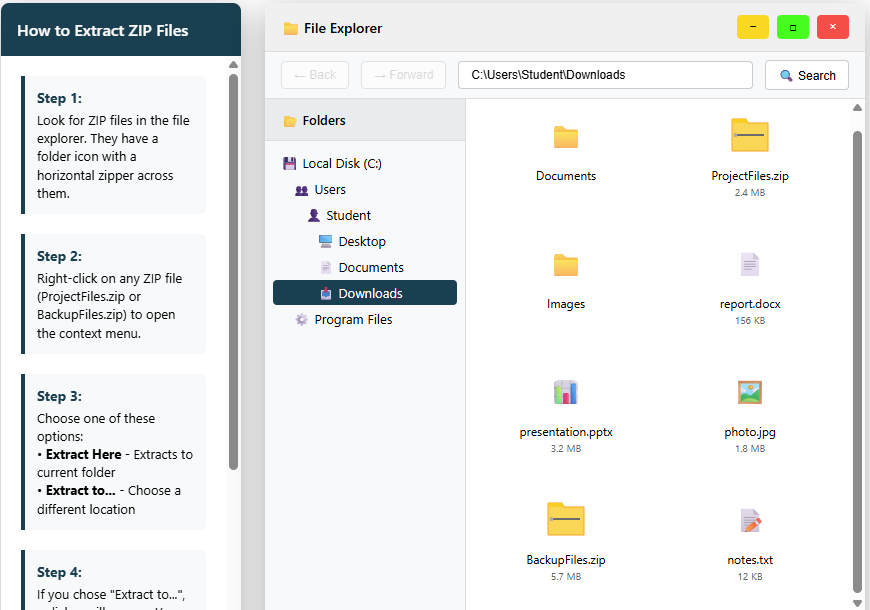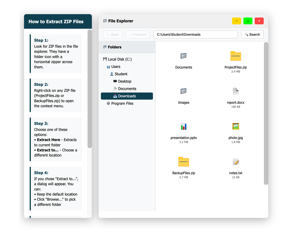 I used Canva's AI code creator to build a simulated "file explorer" that functions as a real file explorer would, including folder systems and different file types. It took 12 versions to land on the code in this demo. Revisions to the code included adding steps for learners to follow, using our brand's accent colors, and ensuring files extracted to different folders properly populate in that folder after the extraction.