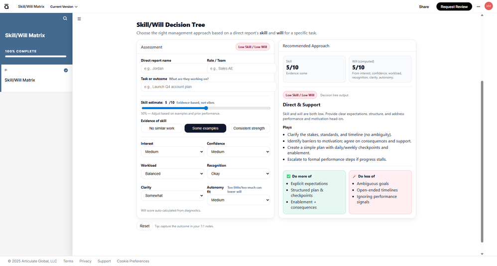 So I tried that with the Skill/Will Matrix. A reusable decision tree to help managers quickly determine an employee’s readiness and choose the right leadership approach. I think this might be even more useful with a print button once it's completed, but I'm just amazed at how quickly this came together.