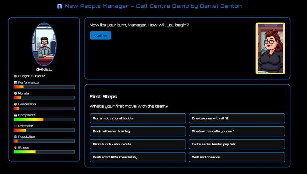For this entry, I partnered with ChatGPT to vibe-code a people manager simulation game. The learner steps into the role of a new call centre manager, taking over a struggling team. Each decision impacts key measures such as performance, morale, complaints, retention, and stress, and if the wrong calls stack up, you risk being “fired”.