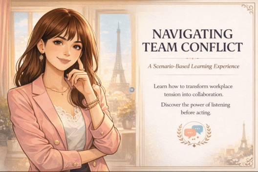 I was inspired by Emily in Paris, a show about navigating messy, real conflicts with style and empathy. So I created a scenario-based learning experience where learners step into her shoes and make decisions that actually matter.