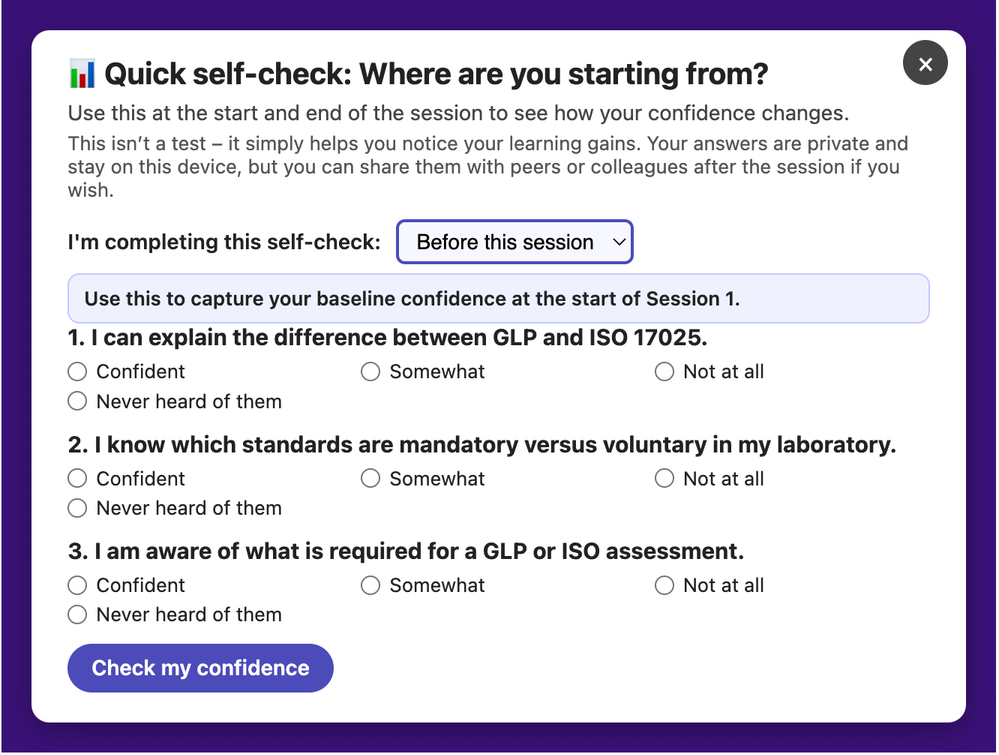 The goal was to give learners a way to benchmark their confidence and awareness before and after a session, helping them see their own progress and prompting metacognitive reflection — without the need for LMS data capture.