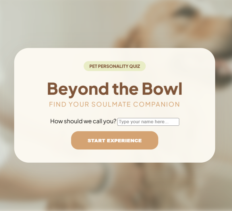 Ready to meet your perfect match? From a fast-paced treat-catching game to ranking your top priorities, this experience reveals the pet that fits your lifestyle. Start the journey now and find the forever friend you were always meant to have! Beyond the Bowl - find your soulmate companion