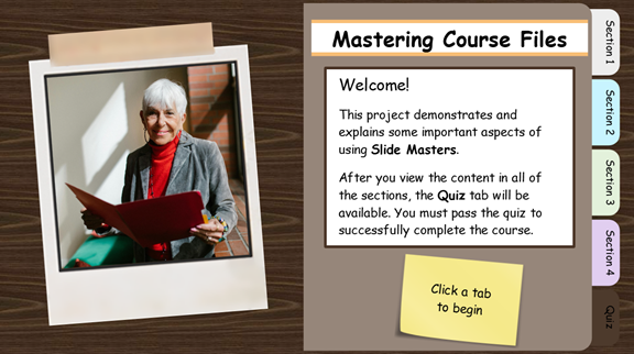 This project is based on an old design from the early days of Storyline. Content is organized in "folders" accessed via "tabs." It's a simple, clean design that perhaps others will find useful.