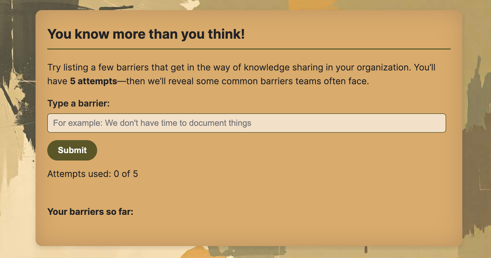 Essentially, the user types in what they think is a Knowledge Management Barrier and see if it matches once of the barriers they'll learn about later. I limited it to 5 tries so it's not infuriating but also stops you after trying too much. You get feedback noting if you got one or not and then at the end, you can see which ones you got and which you missed.