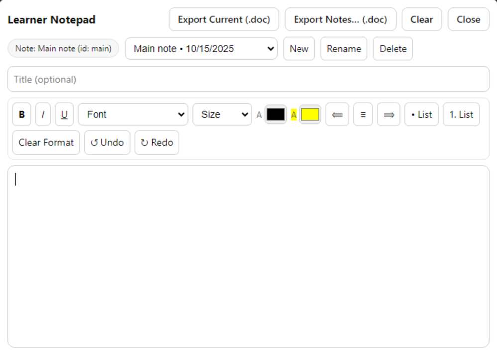 - The learner can export the current notes or a selection of multiple notes into a Word document.