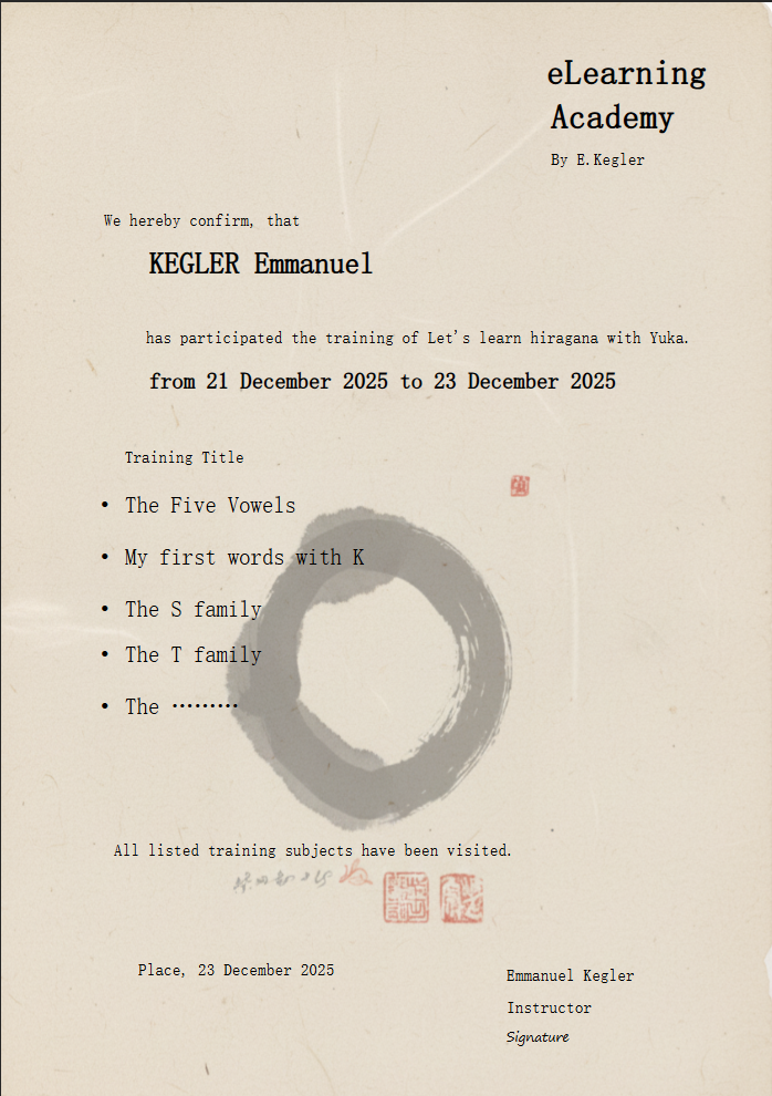 I created this certificate so that learners can print their own certificates. The From-To date is automatically taken from the PC and the duration can be adjusted in the Java script.