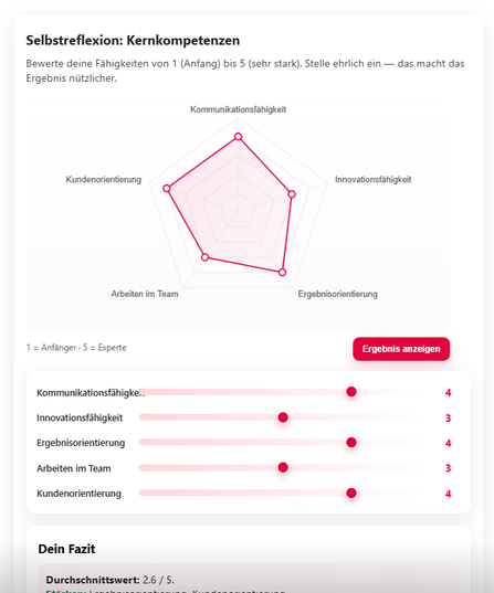 - Self-Assessment via Sliders: Users rate their competencies on different dimensions using sliders.