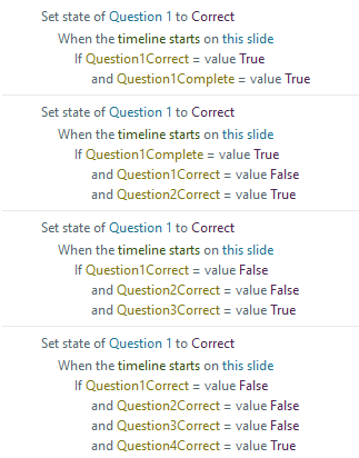 For example, the red at the base of the fire reveals if a user gets one of the four questions correct. To achieve this, my triggers look like this: