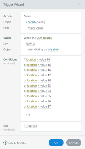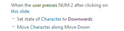 Lastly, two triggers are created (NUM 2 appears when you hit Arrow Down on your keyboard). Your character now moves around the Canvas.