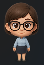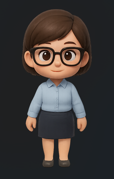 Comically small body. Very large head. Female. 3D style. High resolution. Office clothes. Short hair. Glasses. Transparent background. Disney style.