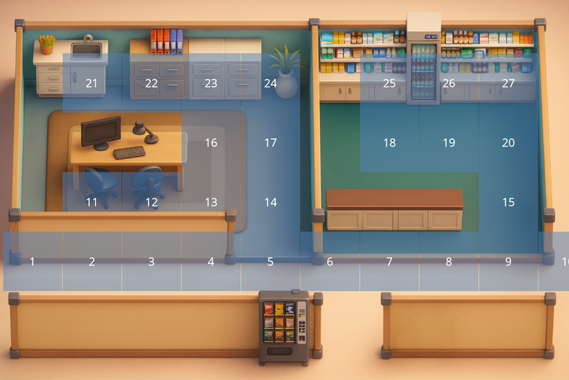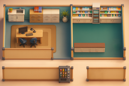 Can you create an exact replica of this image, but make it beautiful 3d top-down style. Make the colors pleasant and give it a disney vibe so that the scene feels warm and welcoming. Keep the layout the same.