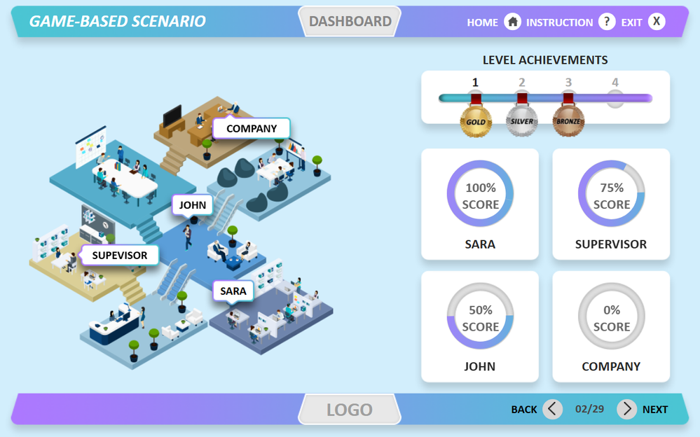 • Each level presents realistic workplace situations that require learner judgment