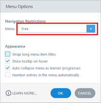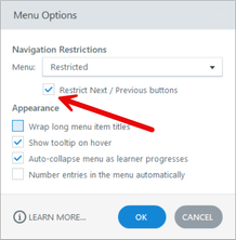Menu navigation settings 2It doesn't show that checkbox for Restrict Next / Previous, but it still behaves as if the buttons are restricted when published. To change, you have to go back in, select Restricted from the dropdown, uncheck⬜ Restrict Next / Previous, then re-select Free from the dropdown.