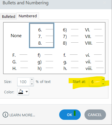 I have to change an enormous amount of bullet numbers. Can the "Start at:" feature be moved to the first screen of the numbered bullet button or added as a toolbar/ribbon feature?