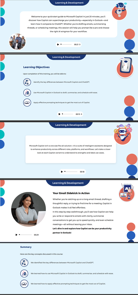 To make my Copilot training course more visually engaging, I used Rise 360’s custom block feature to break up the standard flow and spotlight key concepts.