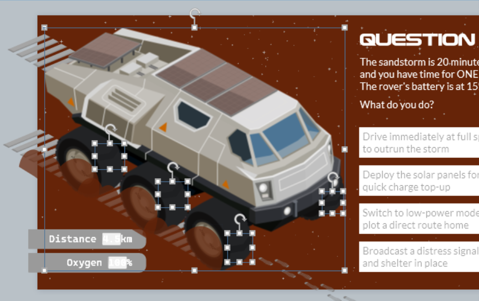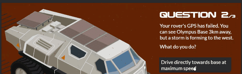 Having access to high-quality, easy-to-use graphics allowed me to focus on the instructional elements and the scoring mechanic. The 'wronger' your answer, the quicker your oxygen will deplete. Even if you reach the third question, if your oxygen hits zero, you will have to start again.
