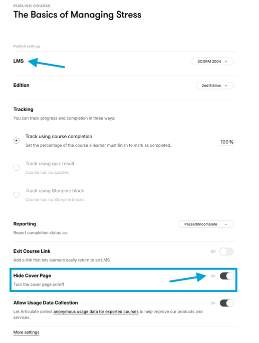 You also asked how to delete the home page of a template in Rise 360. Are you hoping to remove the template's main menu page so that the course begins on Lesson 1? If so, when you publish the course for LMS, you can hide the cover page on the publishing screen, shown below.