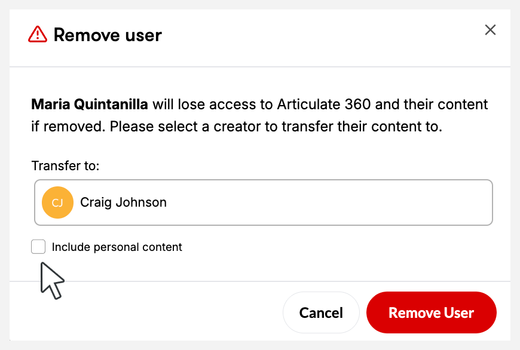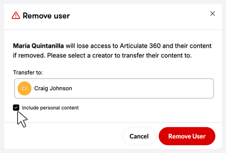 To remove a user and retain access to their personal content in the transfer, keep Include personal content selected and click Remove User, as shown below: