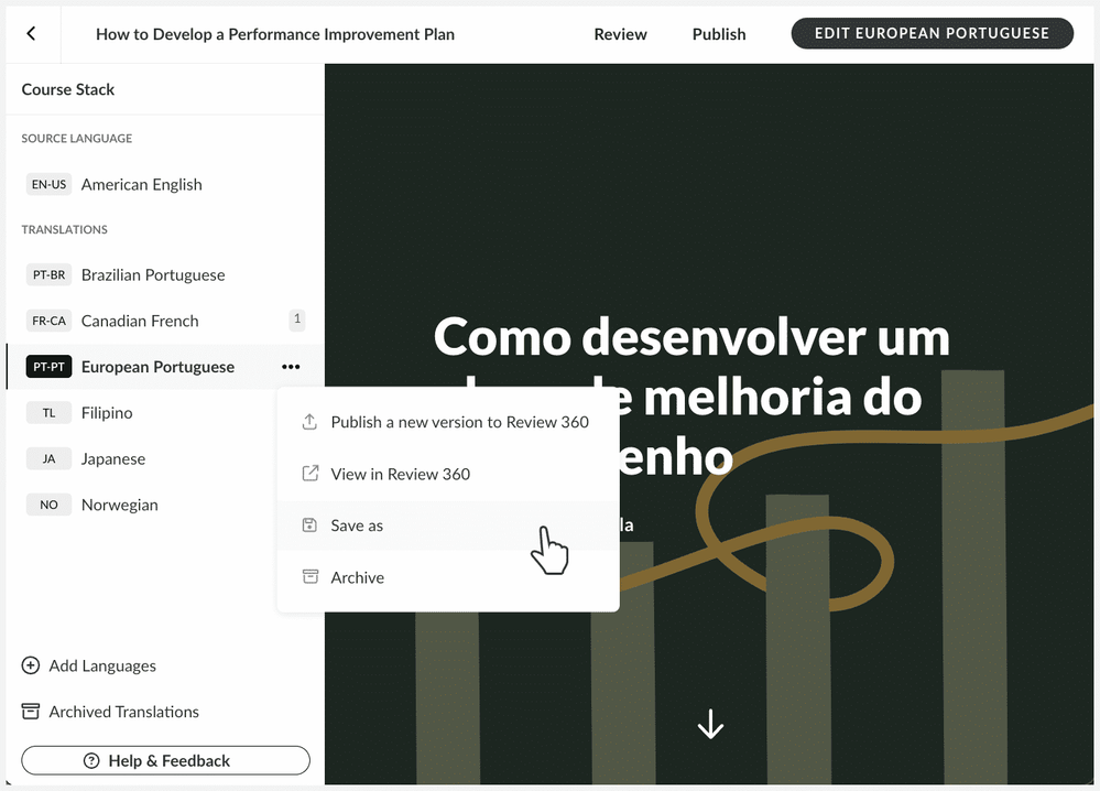 With Articulate Localization, you can translate course and microlearning content into 70+ languages and manage all the language versions as a single project, right from the Rise 360 dashboard. Read on to learn how to translate and share the translations with validators.