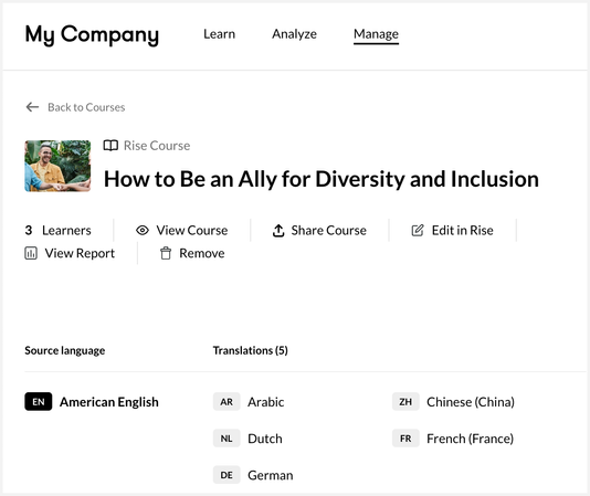 We’re ending support for early-access versions of multi-language Rise 360 content. Learn how to update your courses.