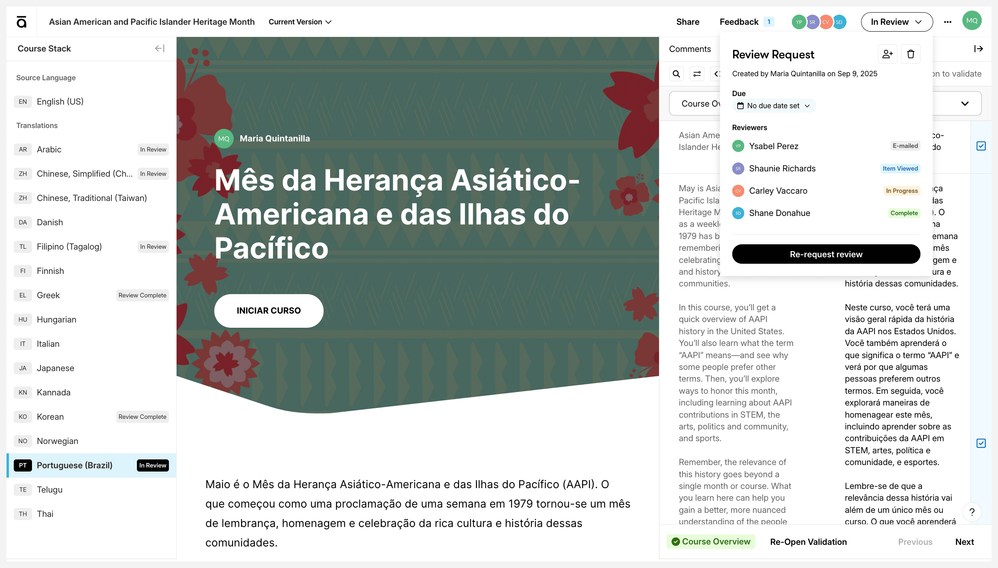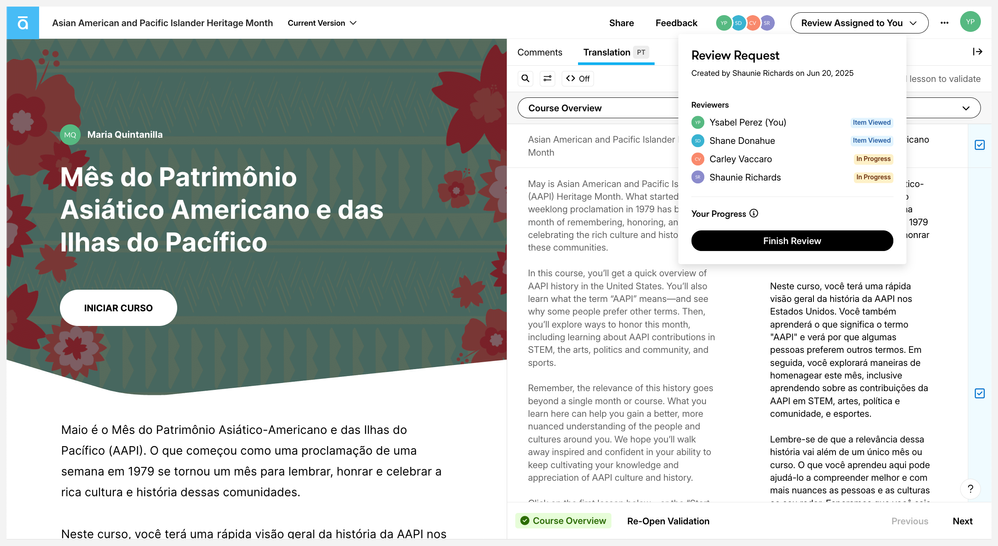 Articulate Localization leverages the collaborative workflows in Review 360 to speed up the process of human validation for AI translations. Once you publish your multi-language course to Review 360, you can assign validators to review the AI translation and keep track of their progress. Watch this video to learn about the validation experience for authors and validators using a multi-language Rise 360 course. Then read on for more detailed steps.