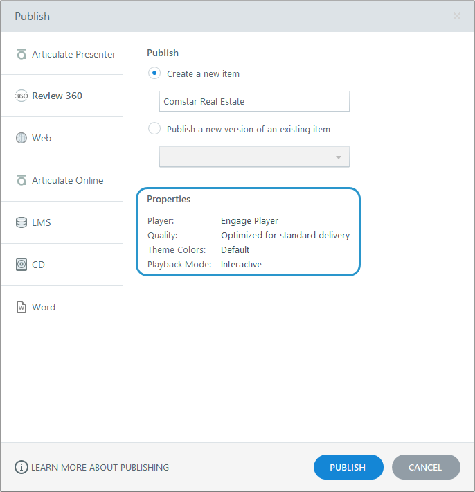 Engage 360 supports several publish options, described below. For this tutorial, let’s publish to Review 360 where you can collaborate with stakeholders and subject matter experts.