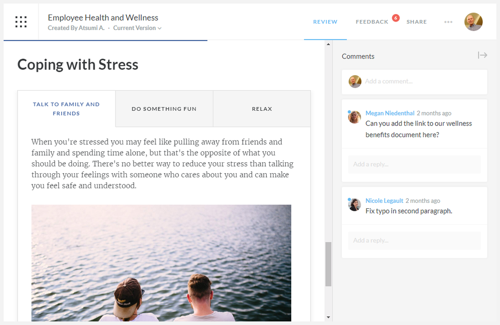 If the content you’re reviewing is a video, you can immediately watch the video. If the content is an interactive course, you can jump right into the course content. And you can use the sidebar to post feedback and participate in discussions along the way. Learn more about working with comments below.