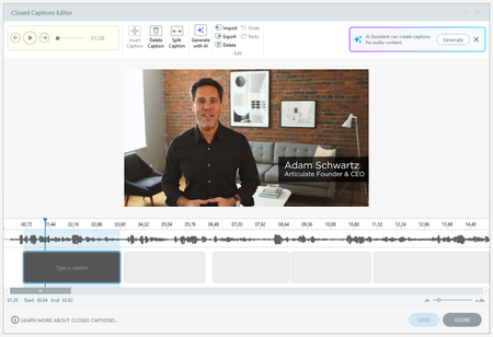 Our new micro e-learning course dives into the top 3 questions shaping the future of AI in instructional design. Hear expert audio insights, explore real-world examples and discover practical ways to bring AI into your own projects. 👉 Click the link below to start learning and unlock new possibilities with AI: https://www.swiftelearningservices.com/ai-in-e-learning/88Views1like0CommentsStoryline 360: Creating and Editing Closed Captions With the Built-in Editor