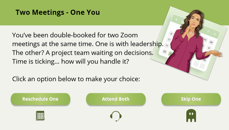 This week I am sharing an example I built a while back where the learner chooses an avatar. The characters are part of a button set, and if you try to proceed without picking an avatar, an error layer will show. Slide 2 shows the avatar, and displays a name variable that was set on the previous slide. View the example.Two Meetings. One You