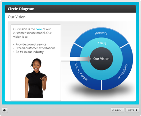 The circle diagram interaction in Engage 360 lets learners examine the relationship of items in a circular hierarchy. Use the circle diagram interaction to: Show related items within a hierarchy. Organize concepts into segments and layers. Graphically depict a philosophy or approach. Exploring the Editor Adding Layers and Segments to a Circle Diagram Changing the Color of Layers Rotating Layers Renaming Segments Rearranging Layers and Segments Deleting Layers and Segments Adding Content to Segments Changing the Placement of the Circle Exploring the Editor The circle diagram editor has three columns with the following panels: Steps Located in the upper left corner of the editor, this panel is used to manage layers and segments for the circle diagram. Segments Located in the lower left corner, this panel is used to select segments of the circle for editing. It also provides a dynamic preview of the circle's layout. Text Located in the middle of the screen, this panel is used to add text to each segment. Audio Located in the upper right corner of the editor, this panel is used to add and edit audio. Media Located in the lower right corner, this panel is used to add pictures, characters, and videos. Here are some tips for working with the editor: Change the width of a column by dragging its boundary with your mouse. Expand the Steps panel or Segments panel by dragging the boundary between them up or down. Click the triangle beside any layer in the Steps panel to collapse or expand it. Click the triangle in the upper right corner of the Segments panel to collapse it if you need more room to work with the Steps panel. Click it again to reopen the panel. Click the triangle in the upper right corner of the Audio panel to collapse it if you need more room to work with the Media panel. Click it again to reopen the panel. Adding Layers and Segments to a Circle Diagram Each step in a circle diagram interaction is called a segment, and segments are grouped into layers. Layers: To add a layer to your diagram, do either of the following: Press Ctrl+G. Go to the Circle Diagram tab on the ribbon and click Add Layer. New layers get added to the outside of the circle. Segments: To add a segment, do any of the following: Press Ctrl+M. Go to the Circle Diagram tab on the ribbon and click Add Segment. Click the Create a new step button in the lower left corner of the Steps panel. Click the Duplicate button at the bottom of the Steps panel to copy the currently selected segment(s). New segments get added just below the segment that's currently selected in the Steps panel. If an entire layer is selected, new segments get added to the end of the layer. Segments can't be added to the core layer, introduction, or summary. Tip: A circle diagram interaction can have up to 11 layers and up to 20 segments per layer. Changing the Color of Layers To change the color of a layer, do the following: Select the layer in the Steps panel or in the Segments panel. Go to the Circle Diagram tab on the ribbon and click Layer Color. Choose one of the predefined colors, or click More Colors at the bottom of the drop-down and specify a custom color. Tip: Segments on the same layer can't be different colors. Rotating Layers You can rotate a layer to change the position of its segments in relation to other layers. Here's how: Select the layer in the Steps panel or in the Segments panel. Go to the Circle Diagram tab on the ribbon and click Rotation. Choose one of the rotation values. Renaming Segments To rename a segment, do either of the following: Double-click the segment in the Steps panel to open it for editing. Type the new name and press the Enter key on your keyboard. Select the segment in the Steps panel, then type the new name in the title field at the top of the text panel. Tip: You can rename the introduction or summary in the same way. (Layers can't be renamed.) Rearranging Layers and Segments Here's how to change the order of layers and segments. Layers: Select one or more layers in the Steps panel and do either of the following: Drag them to a new location in the list. An orange line will move with your mouse to indicate where the layers will be dropped when your mouse button is released. Go to the Circle Diagram tab on the ribbon, click Move Layer, then select In or Out. Use the Up and Down arrows at the bottom of the Steps panel. Segments: Select one or more segments in the Steps panel and do any of the following: Drag them to a new location in the list. An orange line will move with your mouse to indicate where the segments will be dropped when your mouse button is released. Go to the Circle Diagram tab on the ribbon and click Move Segment. To move segments to a different layer, select either In or Out. To change their position on the same layer, select either Counterclockwise or Clockwise. Use the Up and Down arrows at the bottom of the Steps panel. Tip: The introduction and summary can't be moved, nor can a segment be moved when it's the only one on a particular layer. Deleting Layers and Segments To delete a layer or segment, select it in the Steps panel and do any of the following: Press the Delete key on your keyboard. Go to the Circle Diagram tab on the ribbon, then click Delete Layer or Delete Segment. Click the Delete button at the bottom of the Steps panel. Tip: You can't delete the introduction or summary, but you can hide them. A segment can't be deleted when it's the only one on a particular layer. Adding Content to Segments To add text, audio, and media to each segment in your interaction, see these user guides: Adding and Formatting Text Adding Audio Adding Media Changing the Placement of the Circle Choose whether you want the circle to appear on the left or the right side of your interaction. Here’s how: Go to the Circle Diagram tab on the ribbon and click Interaction Properties. Select the Circle Diagram tab on the left side of the window. Choose Left or Right from the drop-down. Click OK. You Might Al