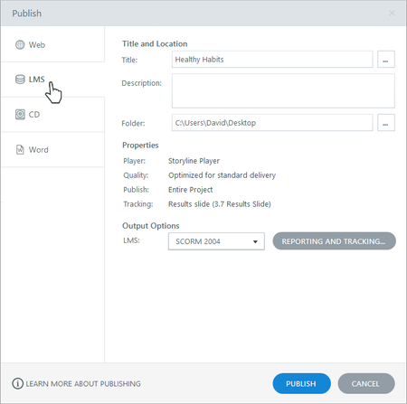 If you’re using a learning management system (LMS), a learning record store (LRS), or both to distribute and track e-learning content, you’ll want to use the LMS/LRS publishing option in Storyline 360. Here’s how. Enter Title, Description, and Folder Location Enter Additional Project Info (Optional) Adjust the Player Properties and Quality Settings Choose to Publish a Slide, a Scene, or the Entire Course Choose Reporting and Tracking Options Publish Distribute Your Published Course Step 1: Enter Title, Description, and Folder Location Go to the Home tab on the ribbon and click Publish. When the Publish window appears, select the LMS / LRS tab on the left. Enter the Title the way you want it to appear in your published output. (If you have a title placeholder on the first slide, the title defaults to the text entered in that title placeholder. If you don’t have a title placeholder on the first slide, the title defaults to the name of your project file. You can change the title of your published course here without affecting the name of your project file or the title placeholder on the first slide.) The maximum length for a project title is 80 characters; the maximum length for each output folder name is eight words. Use the Description field to define the purpose of your course. It won’t appear in your published output. Use the Folder field to choose where you want to publish your course—for example, your computer desktop. Click the ellipsis button (...) to browse to a location. Storyline 360 will create a new folder in that spot with all the files needed to operate your course. Tips: Always publish to your local hard drive. Publishing to a network drive or a USB drive can cause problems with your published output. After publishing to your local hard drive, upload the output to your LMS, LRS, or both for testing and distribution. Install the November 2021 update or later for Storyline 360 to send results to an LRS. Learn more. Step 2: Enter Additional Project Info (Optional) Click the ellipsis button (...) next to the Title field to define additional project information. Currently, this information is for your reference only. It won’t be visible in your published output. The Title and Description fields are the same as those on the Publish window (see the previous step). The image below the Title field is the course thumbnail. By default, Storyline 360 uses an image of the first slide in your course, but you can choose a different image. Just click the hyperlinked text below the image, then select a different slide or click Picture from File to choose an image on your hard drive. You can enter values for the Author, Email, Website, Duration, Date, Version, and Keywords (separated by commas) fields. The Identifier is a unique string of characters assigned by Storyline 360 that your LMS/LRS uses to identify your course. If you’re republishing a course that’s already in your LMS/LRS, don’t change the value in this field. When you’re finished customizing the project information, click OK to return to the Publish window. Step 3: Adjust the Player Properties and Quality Settings Use the Properties section of the Publish window to make last-minute changes to your course player and quality settings. The Player property shows the name of the player currently assigned to your project. (The player is the frame around your slide content.) To make adjustments to your player, click the player name to open the player editor. The Quality property lets you choose adaptive or static video quality and control the compression settings for audio clips, static videos, and JPG images. The quality settings default to whatever you used the last time you published a course. To change them, click the Quality property, make your adjustments, and click OK. There are now two video quality options. Select Adaptive to automatically adjust the video quality (high, medium, or low) to the learner’s internet speed and prevent buffering. Learn more. Choose Static to deliver videos with the same quality to all learners, which could cause buffering. Drag the Static slider to change the video compression. Note that higher values give you higher-quality output but also larger file sizes (which means longer download times for learners with slow connections). Lower values give you smaller file sizes and faster download times, but the quality will be lower as well. Drag the Audio Quality slider to adjust the compression settings Storyline 360 uses for audio. Mark the Optimize audio volume box to normalize audio throughout your course for consistent volume across all slides. Tip: If your course audio already has consistent volume, you can speed up the publishing process by unchecking this option. Drag the JPG Quality slider to adjust the compression settings Storyline 360 uses for JPG images. Click Reset to standard optimization to use the default settings: adaptive video quality, audio bitrate of 56 kbps, and JPG image quality of 100%. Step 4: Choose to Publish a Slide, a Scene, or the Entire Course By default, Storyline 360 will publish your entire course. However, you can now choose to publish a specific scene from your course or even just a single slide. This is helpful when you want to publish multiple courses from the same project file. Just click the Publish property, then choose the entire project, a single scene, or a single slide. Step 5: Choose Reporting and Tracking Options Click the Reporting and Tracking button to open the following window, where you can choose how your LMS/LRS reports and tracks learners’ progress. Click the LMS tab in the upper left corner, then choose a standard from the Report to an LMS drop-down. Ask your LMS administrator if you’re not sure which standard to use. Storyline 360 supports cmi5, xAPI (Tin Can API), SCORM 2004, SCORM 1.2, and AICC. Complete the fields in the LMS Course Information section with these tips in mind: The course Identifier is a unique string of 