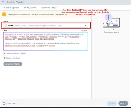 In the new Storyline release from 12/2/2025 feature of auto generating AI voice for translated files, what voice is used? When I select my audio track that is now in Spanish, it still shows the English voice. Is there a place i can set a default voice to use for each language? If not, can this be added please?64Views0likes3CommentsArticulate Localization: what's your feedback?
