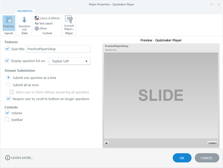 In Quizmaker 360, the player refers to the interface around the perimeter of your quiz slides. In this tutorial, you’ll learn how to customize the quiz player. You can choose which features appear on the player, modify the colors and font, change the text labels, adjust the size, and control how the quiz behaves when learners launch it more than once. You can even make the player invisible. Watch this video introduction, then follow the activities below to practice. Practice Activities: Open the Player Properties Choose Your Player Features Customize the Question List Change the Colors, Font, and Font Size Customize the Text Labels Change the Player Size and Resume Behavior Save Your Customized Player Practice Activity: Open the Player Properties First, we need to open the player properties. Open PracticePlayerSetup.quiz from your practice files. Go to the Home tab on the Quizmaker ribbon and click Player. Notice the three main sections of the player properties window: Player categories appear on the ribbon across the top of the window. The selection pane on the left side of the window is where you make modifications. The interactive preview pane on the right side of the window updates automatically as you makes changes. Practice Activity: Choose Your Player Features The player properties window always opens directly to the Features category where you can choose which features to include on your player, such as title, question list, volume controller, and seekbar. It’s also where you choose the answer submission method for question slides. Let’s hide a couple player features and set the answer submission method. Uncheck the Quiz title box. Notice that the interactive preview updates with your change. Select Submit one question at a time for the answer submission method. Uncheck the Volume box. To learn more about the player features, see this user guide. Practice Activity: Customize the Question List In this activity, we’ll customize the question list by renaming the slides and locking the navigation. Click Question List on the player properties ribbon. Rename the first slide by double-clicking it, typing a new name, and pressing Enter on your keyboard. Name it Question 1. Tip: Renaming slides only affects how they look in the question list. It doesn’t impact the question text on the slides in your quiz. Hide slide 2 by selecting it and clicking the eye icon below the question list. Tip: Hiding slides doesn’t remove them from your quiz. It just prevents them from showing in the question list. Click the gear icon below the question list to see additional options. Mark the box to Wrap long question list item titles. To learn more about customizing the question list, see this user guide. Practice Activity: Change the Colors, Font, and Font Size In this activity, we’ll change the color scheme for our quiz player, choose a different font, and increase the player font size. Click Colors & Effects on the player properties ribbon. Select a different color scheme. Change the player font to Articulate Light. Increase the player font size to 120% To learn more about changing the player colors, font, and font size, see this user guide. Note: Currently, the color and font options only apply to the standard player, not the responsive player. See this interactive demo to know which player properties are supported in the responsive player. Practice Activity: Customize the Text Labels In this activity, we’ll make a change to one of the player text labels. Click Text Labels on the player properties ribbon. Scroll down to the label called Question drop-down list for Quizmaker quizzes. Click the custom text field for this label and change it to QUESTIONS. Click Update Preview below the text labels list and watch the Question List tab change in the preview pane. To learn more about customizing the player text labels, see this user guide. Practice Activity: Change the Player Size and Resume Behavior In this activity, we’ll change how the player scales in learners’ browsers and how the quiz behaves when learners launch it more than once. Click Other on the player properties ribbon. Set the Player size property to Scale player to fill browser window. Change the resume behavior by setting the On restart property to Always resume. To learn more about controlling the browser size and player size, see this user guide. To learn more about the resume behavior, see this user guide. To learn more about right-to-left language support, see this user guide. Practice Activity: Save Your Customized Player Finally, let’s save our custom player, so we can use it with other Quizmaker quizzes. Click Current Player on the ribbon and choose Save as. Give your custom player a name and click OK. If you don’t want to keep the custom player we created in this tutorial, click Current Player on the ribbon and choose Delete. To learn more about saving custom players, switching to a different player, and sharing custom players, see this user guide. Summary In this tutorial, you learned how to customize the quiz player in Quizmaker 360, including features, colors, font, text labels, size, and resume behavior. To dive even deeper into player customization, see this user guide. In the next tutorial, we’ll publish a quiz.147Views0likes0CommentsQuizmaker 360: Organizing and Randomizing Quiz Questions