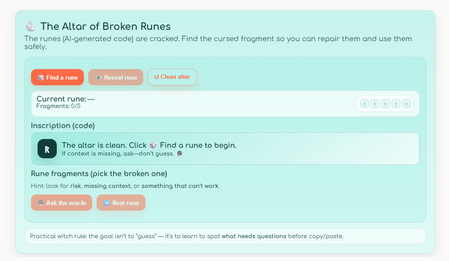 Try it here! Do you feel like a witch casting mysterious spells every time you use AI to create code? This little Rise is a bit about that: when vibe coding, itâs easy to copy/paste something that looks right⌠but has a tiny crack hidden inside. And unlike real magic, code doesnât âkind ofâ work. So, why not turning that feeling into a ritual you can trust? Youâll meet a handful of âbroken runesâ (small AI-generated code snippets). Your job is to inspect the inscription, pick the fragment that is broken, and then ask the oracle to reveal what went wrong and, most importantly: how to fix it. The point isnât to guess correctly on the first try. The point is to train your eyes to spot the things that deserve a second look: mismatched names, missing context, and logic traps that run but lie. By the end, youâll have a simple review habit you can use anytime AI hands you code: trace what triggers what â check names â check assumptions â check logic. No smoke, no mirrors. Just practical witchcraft for safer vibe coding. ^^ Psss: ⨠From witch to witch: if you spot an error in my code or explanations, please correct me. This is a shared circle of learning and we definitely donât want to accidentally invoke a malignant entity. đŚââŹ44Views3likes0CommentsEnglish School - Code Block Demo