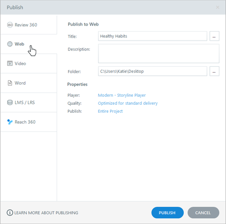 When you want learners to access a Storyline 360 course over the internet or a private intranet, and if you don’t need to track their progress, then web publishing is for you. (If you do need to track learners’ results, publish for LMS/LRS.) Enter Title, Description, and Folder Location Enter Additional Project Info (Optional) Adjust the Player Properties and Quality Settings Choose to Publish a Slide, a Scene, or the Entire Course Publish Distribute Your Published Course Step 1: Enter Title, Description, and Folder Location Go to the Home tab on the ribbon and click Publish. When the Publish window appears, select the Web tab on the left. Enter the Title the way you want it to appear in your published output. (If you have a title placeholder on the first slide, the title defaults to the text entered in that title placeholder. If you don’t have a title placeholder on the first slide, the title defaults to the name of your project file. You can change the title of your published course here without affecting the name of your project file or the title placeholder on the first slide.) The maximum length for a project title is 80 characters; the maximum length for each output folder name is eight words. Use the Description field to document the purpose of your course. It won’t appear in your published output. Use the Folder field to choose where you want to publish your course—for example, your computer desktop. Click the ellipsis button (...) to browse to a location. Storyline 360 will create a new folder in that spot with all the files needed to operate your course. Important: Always publish to your local hard drive. Publishing to a network drive or a USB drive can cause problems with your published output due to latency. After publishing to your local hard drive, upload the output to a web server for testing and distribution. Step 2: Enter Additional Project Info (Optional) Click the ellipsis button (...) next to the Title field to define additional project information. Currently, this information is for your reference only. It won’t be visible in your published output. The Title and Description fields are the same as those on the Publish window (see the previous step). The image below the Title field is the course thumbnail. By default, Storyline 360 uses an image of the first slide in your course, but you can choose a different image. Just click the hyperlinked text below the image, then select a different slide or click Picture from File to choose an image on your hard drive. Enter values for Author, Email, Website, Duration, Date, Version, and Keywords if you’d like. The Identifier applies only to content published for LMS/LRS. When you’re finished customizing the project information, click OK to return to the Publish window. Step 3: Adjust the Player Properties and Quality Settings Use the Properties section of the Publish window to make last-minute changes to your course player and quality settings. The Player property shows the name of the player currently assigned to your project. (The player is the frame around your slide content.) To make adjustments to your player, click the player name to open the player editor. The Quality property lets you choose adaptive or static video quality and control the compression settings for audio clips, static videos, and JPG images. The quality settings default to whatever you used the last time you published a course. To change them, click the Quality property, make your adjustments, and click OK. There are now two video quality options. Select Adaptive to automatically adjust the video quality (high, medium, or low) to the learner’s internet speed and prevent buffering. Learn more. Choose Static to deliver videos with the same quality to all learners, which could cause buffering. Drag the Static slider to change the video compression. Note that higher values give you higher-quality output but also larger file sizes (which means longer download times for learners with slow connections). Lower values give you smaller file sizes and faster download times, but the quality will be lower as well. Drag the Audio Quality slider to adjust the compression settings Storyline 360 uses for audio. Mark the Optimize audio volume box to normalize audio throughout your course for consistent volume across all slides. Tip: If your course audio already has consistent volume, you can speed up the publishing process by unchecking this option. Drag the JPG Quality slider to adjust the compression settings Storyline 360 uses for JPG images. Click Reset to standard optimization to use the default settings: adaptive video quality, audio bitrate of 56 kbps, and JPG image quality of 100%. Step 4: Choose to Publish a Slide, a Scene, or the Entire Course By default, Storyline 360 will publish your entire course. However, you can now choose to publish a specific scene from your course or even just a single slide. This is helpful when you want to publish multiple courses from the same project file. Just click the Publish property, then choose the entire project, a single scene, or a single slide. Step 5: Publish When you’e finished making selections, click the Publish button. When the publishing process is complete, you’ll see the Publish Successful window with several follow-up options. View Project This launches the published course in your default web browser. Important: Since your files have been prepared for web delivery, you might encounter unexpected behavior when viewing the course on your local hard drive. It’s best to upload your published output to a web server for proper testing. Email This opens a new email message with a zipped file of your published course attached. This option is helpful if you need to send your course to a web server administrator for deployment. We don’t recommend emailing a published course to learners. Security restrictions on their computers will prevent some features in your course from working properly. Upload
