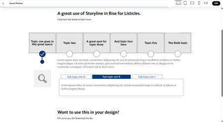 This basic tab style interaction is made in Storyline for use as an alternate way to present a list of content in Rise. This is simple yet modern enough design to add that extra engagement factor and clearly present text, icons, additional content, and more! The Storyline is designed at 1280x500 to allow for HD width format and still allow for the full interaction to fit (without scrolling) in a smaller screen. Download the Storyline file | See it in action here!Storyline's 100th Release