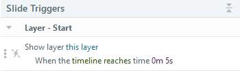 New to Storyline. Learning how to use Layers and Triggers. I have a simple intro with an animated graphic, intro text and start button. Start button is on a layer (not base layer) and I'd like it to appear at a designated timeline time. I have it now set to 5 sec, so that Start button appears after intro text. However, Start button 1) appears before intro text and 2) not at 5 seconds. Start button trigger is: Show layer when timeline reached 0m 5s. Screenshot of the trigger: Any clues as to where I should look to correct the behavior to be what I want? Many thanks!Solved287Views0likes3CommentsUse triggers and variables to cycle through multiple layers in sequence